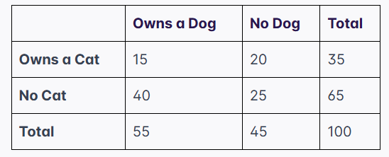 Question: A survey of 100 people asked if they own a cat or a dog. The results are in the table below. Given that a randomly selected person owns a dog, what is the probability they also own a cat?