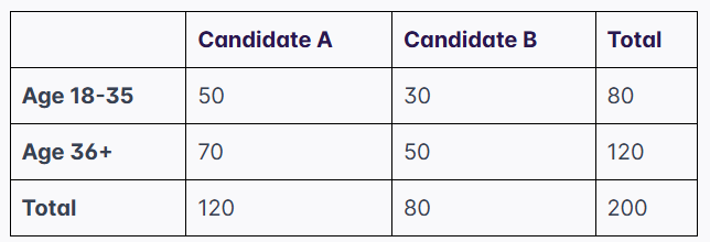 5. Using the voter table, what is the probability that a randomly selected voter is in the 18-35 age group, given that they prefer Candidate B?