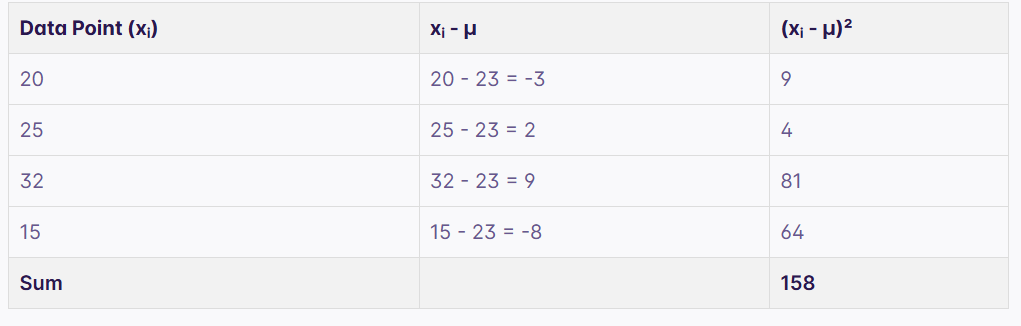 μ = (20 + 25 + 32 + 15) / 4 = 92 / 4 = 23. -