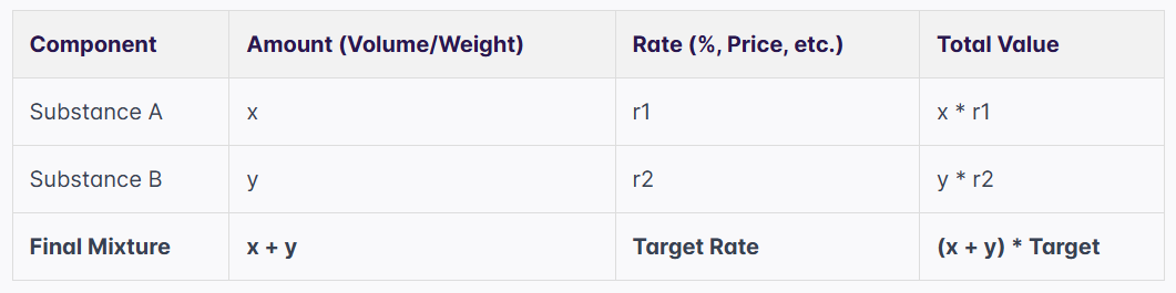 The basic formula is (Amount 1 × Rate 1) + (Amount 2 × Rate 2) = (Total Amount × Final Rate). This balances the total quantity of the specific ingredient before and after mixing.