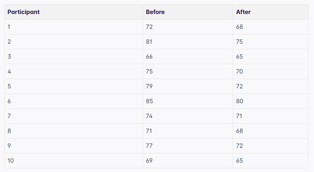 5. (Hard) A fitness trainer wants to test the effectiveness of a new 8-week workout program. They measure the resting heart rate of 10 participants before the program starts and again after it ends. The data (in beats per minute) are as follows: